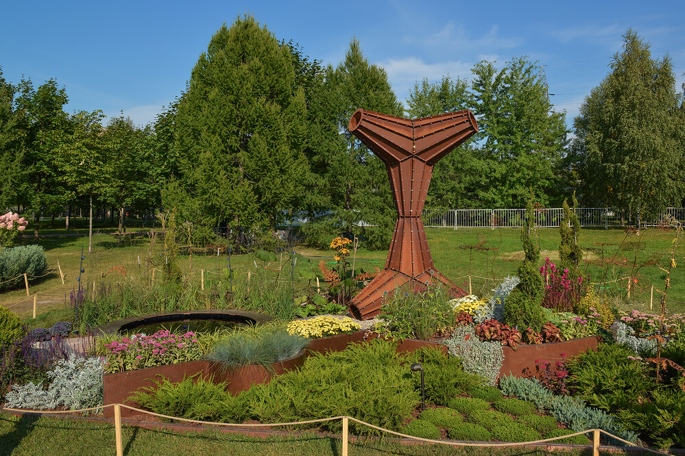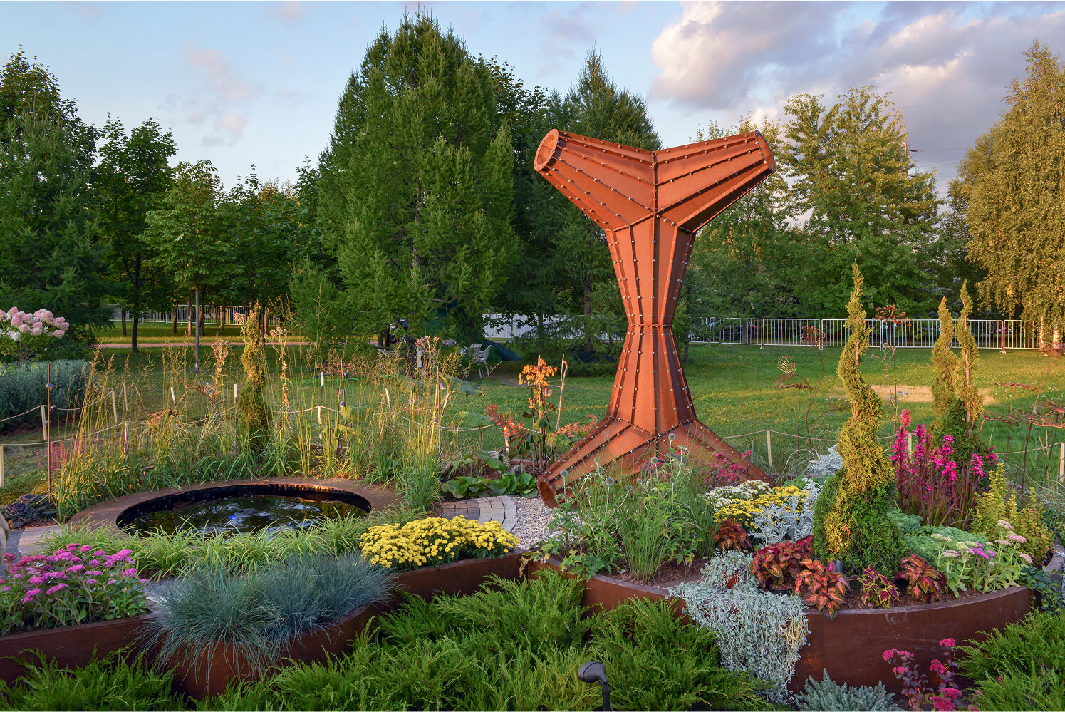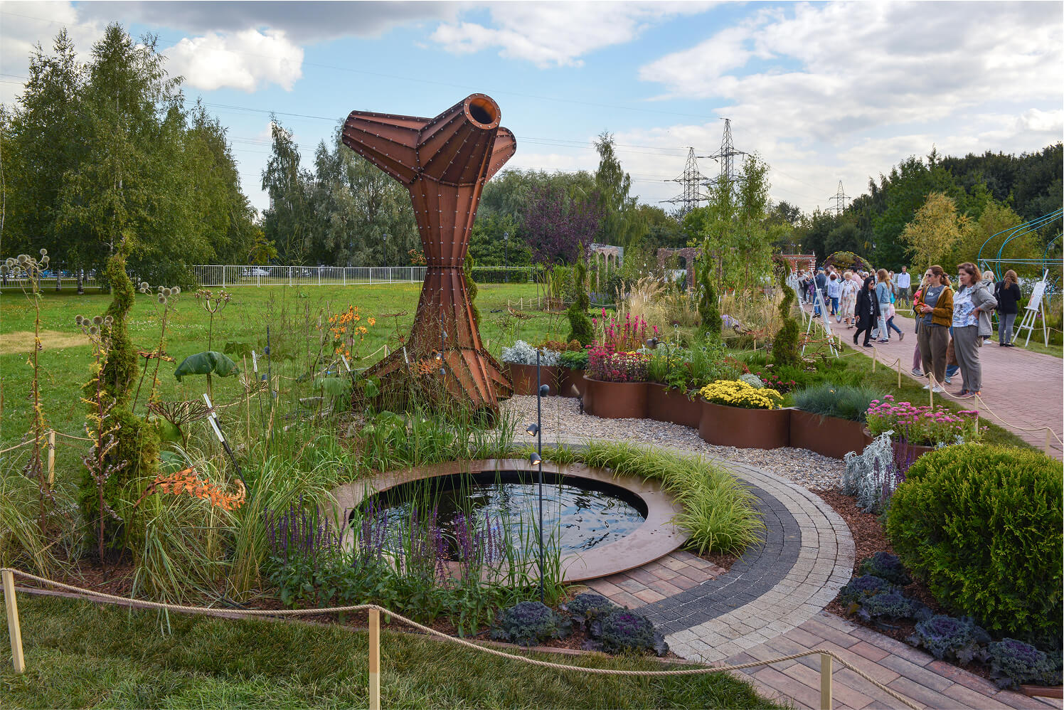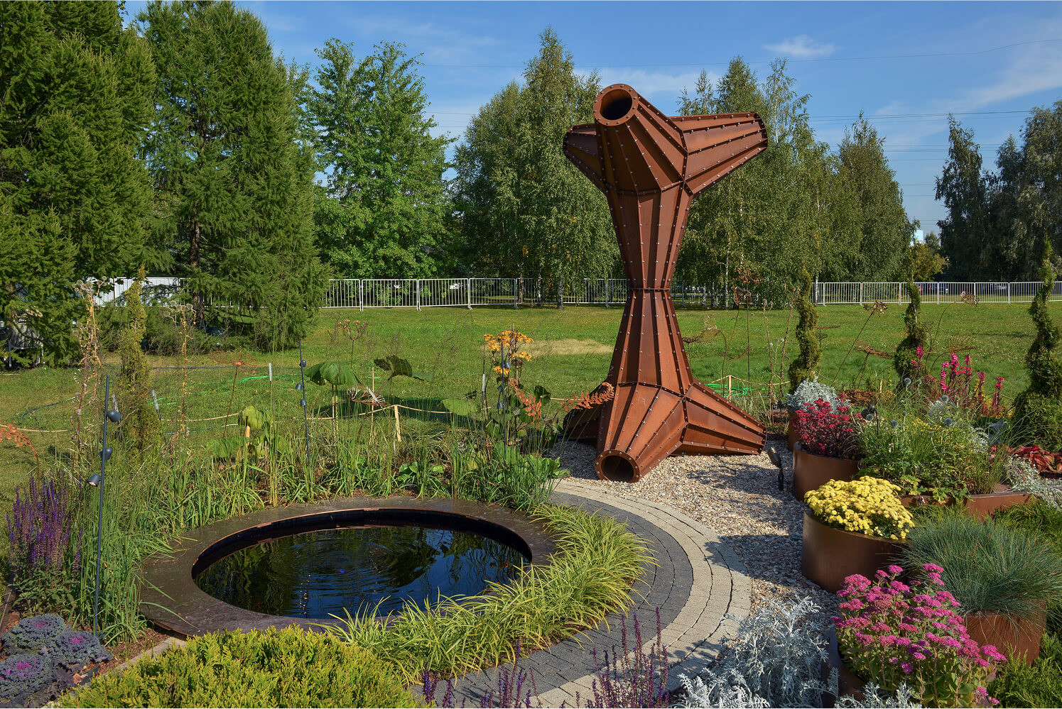 Мы представили момент приземления космического корабля на планету — так центром и арт-объектом нашего сада является скульптура Петра Виноградова. Небольшой водоем с одной стороны символизирует воду, с другой — некую черную дыру (подземелье), куда попали главные герой книги.