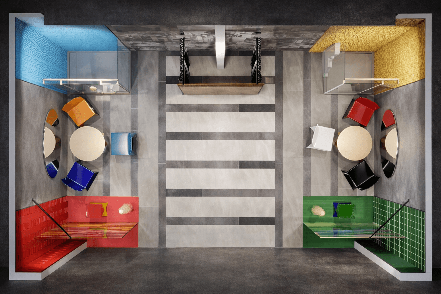 Стекло здесь — архитектурная среда: с керамической печатью, глубиной и светом, который не освещает, а проявляет. Цвет задают краски AVIUM. Пол будущего «Coretec» — тёплый и технологичный, с фактурой камня. Яркая мебель «Parametrica» — напечатана на 3D-принтере, транслирует стиль стенда. Шторы мастерской Галины Лугиной с голографическим эффектом растворяют пространство.