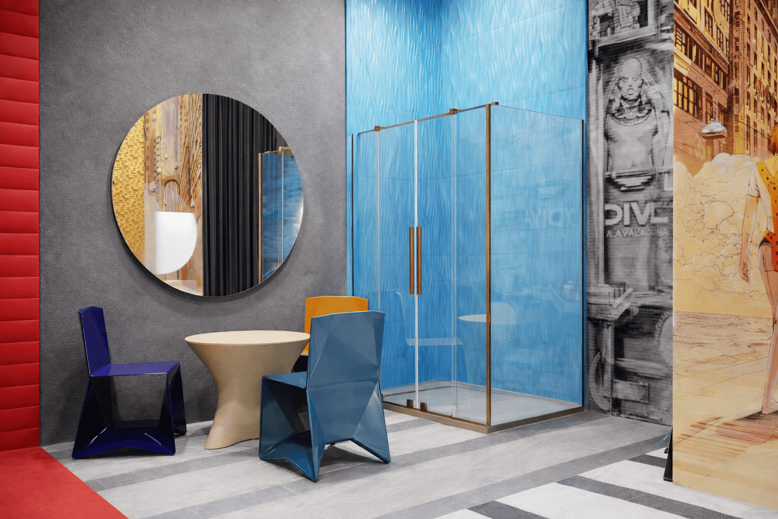 В этих состояниях — душевые перегородки Radaway: прозрачные стекла, даже с «рваным» стеклом, как срез материи, как память о земле. В центре — человек будущего. Стеклянное панно высотой 3 метра с городом и Лилу — образ присутствия, который оживляет пространство.